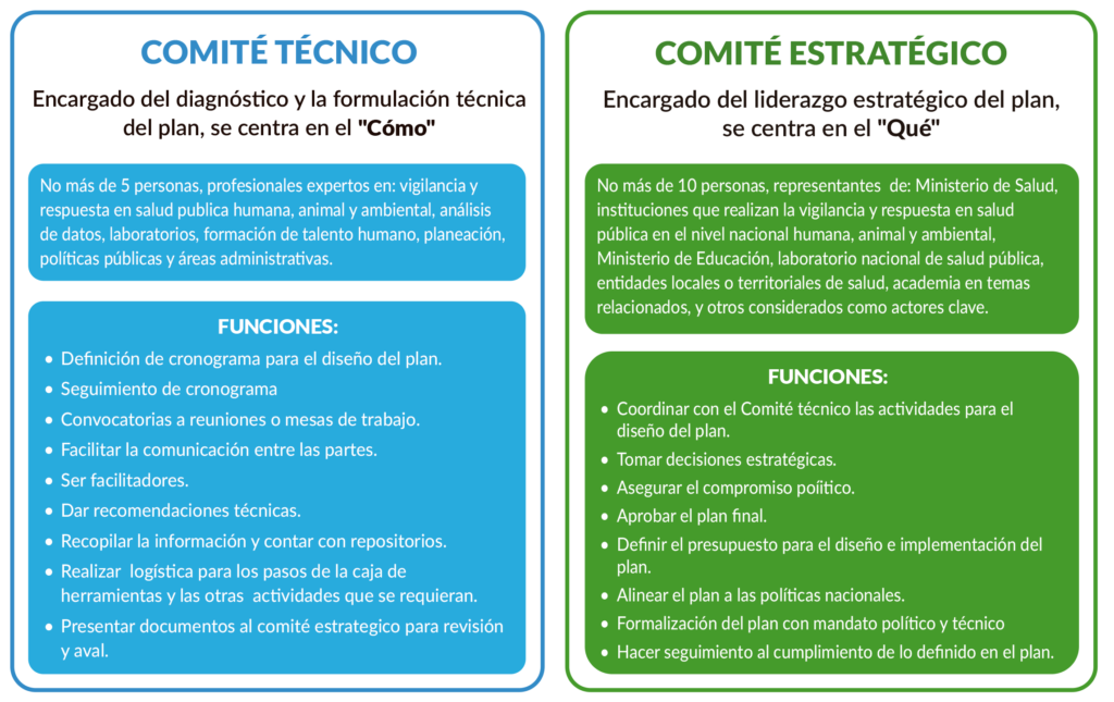 El diseño del plan nacional requiere contar con un equipo de personas con diferentes áreas de especialización y experiencia que faciliten la formulación del mismo. Se propone dos tipos de comités principales liderados por el Ministerio de salud o la entidad que haga sus veces.
